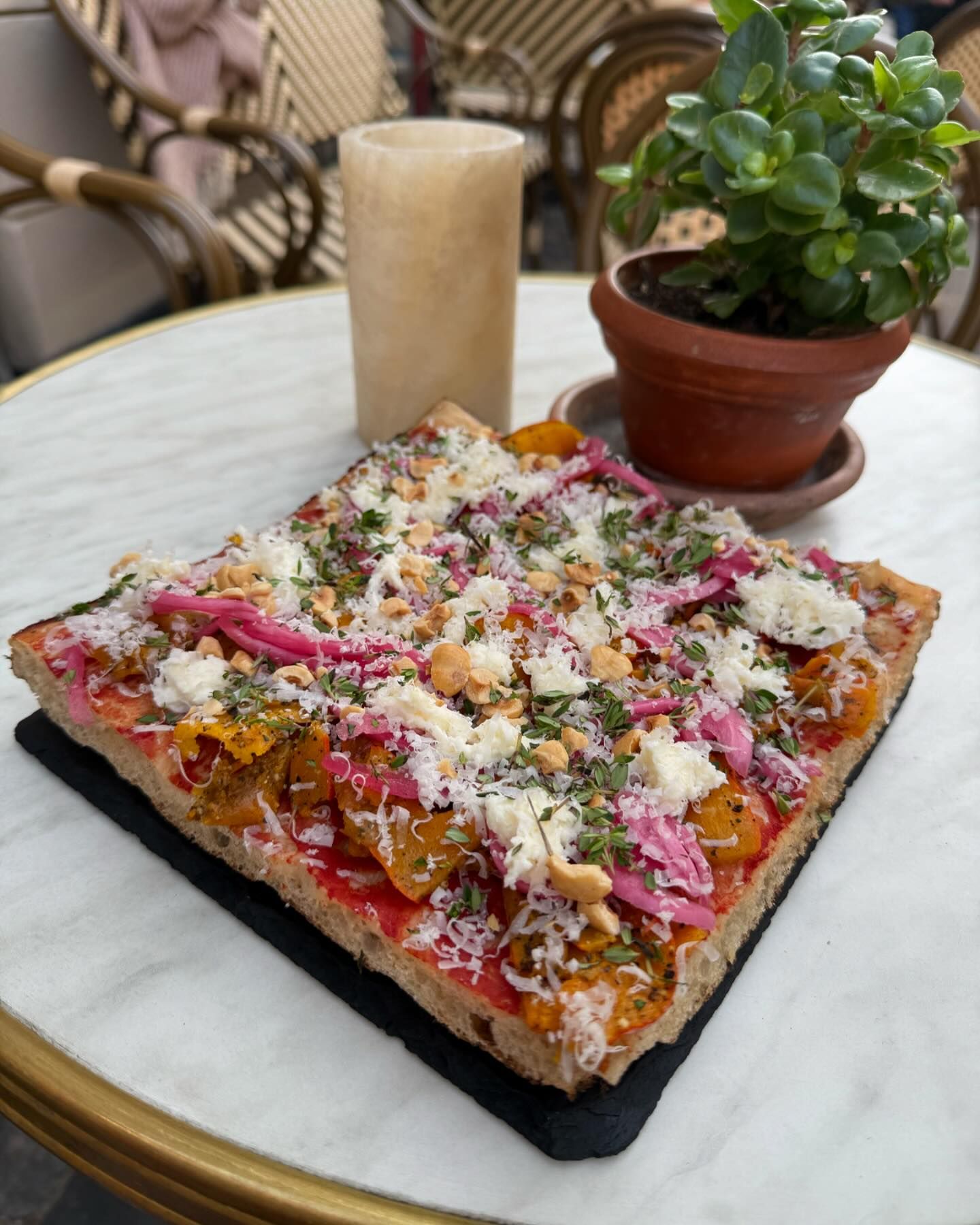 Store vinduespartier trækker dagslyset ind og giver rummet et let og luftigt præg, mens duften af friskbagt surdejspizza og sandwiches straks indfanger sanserne. De bløde nuancer i interiøret – træ, keramik og dæmpede farver – giver rummet varme, og den livlige stemning i lokalet bliver nænsomt balanceret af den rolige atmosfære. Det føles personligt og uformelt, uden at gå på kompromis med kvalitet eller æstetik.