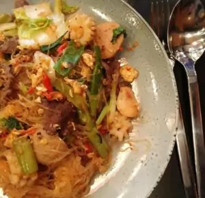 Forretterne inkluderer sprøde indbagte rejer serveret med sød chilisauce og vegetariske forårsruller. Blandt hovedretterne findes klassikere som Pad Thai med rejer, kylling stegt med cashewnødder og tørrede chili, samt oksekød i rød karry med kokosmælk.