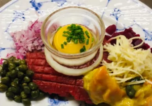 Små lune retter som varm hvidvinsdampede muslinger i løgtangsuppe viser, at køkkenet kan løfte både smørrebrød og fine fiskeretter. Den klassiske oksesteg med brun sovs, hvilede kartofler og friskkogte grøntsager får et moderne twist gennem en syrlig rødkålskompot ved siden af. Til sidst kan du runde af med en klat tatar, hvor råhakket oksekød kombineres med kapers, løg og et skvæt sennep, alt sammen komponeret på en bund af smørstegt toast.