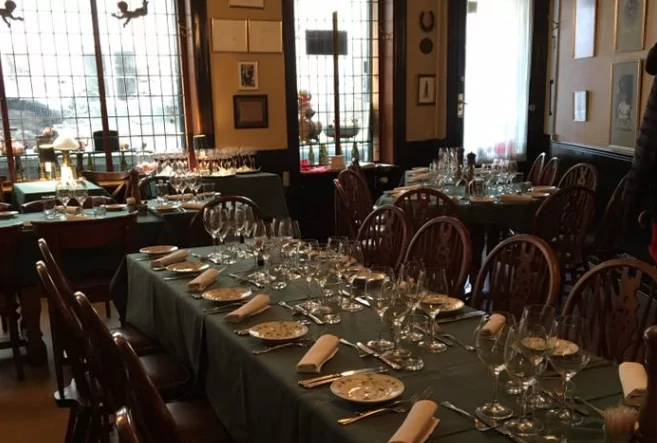 Langs den ene væg står en række solide egetræsborde, hvor både politikere, journalister og madentusiaster finder sig til rette. Modsat leder en solid bar i mørkt træ blikket mod et udvalg af håndplukkede snapsflasker og hjemmeinfunderede likører, som tjenerne præsenterer med et nik og et lille smil. Væggenes enkelte udsmykning i form af gamle fotografier fra slottets køkken og fine kobberkar minder om stedets rødder i frokosttraditionen.