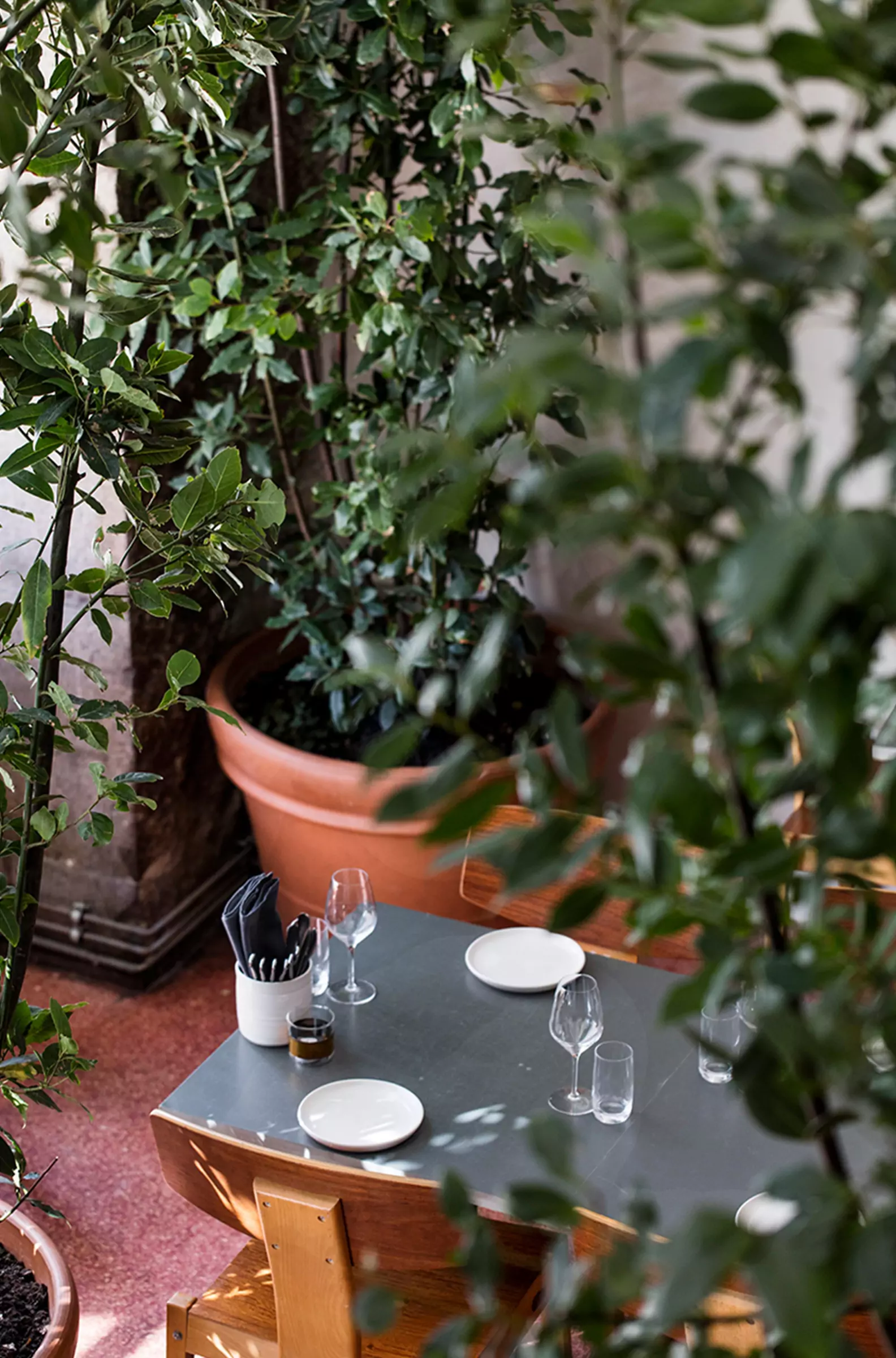 Spuntino formår at skabe en stemning, der leder tankerne hen på en italiensk gårdhave en lun sommeraften. Indretningen er gennemtænkt med grønne planter og glødepærer, der hænger fra loftet og kaster et varmt skær over rummet. Dette samspil af elementer skaber en hyggelig og afslappet atmosfære, hvor gæsterne føler sig velkomne og godt tilpas.
