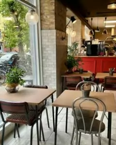 Hos Stefanos Pizzabar Jr. er stemningen lige så indbydende som maden – en perfekt blanding af afslappet komfort og livlig energi. Indretningen kombinerer moderne minimalistisk design med et strejf af hyggelig varme, hvor de rå betonvægge og de enkle træmøbler står i kontrast til de farverige kunstværker, der pynter på væggene.