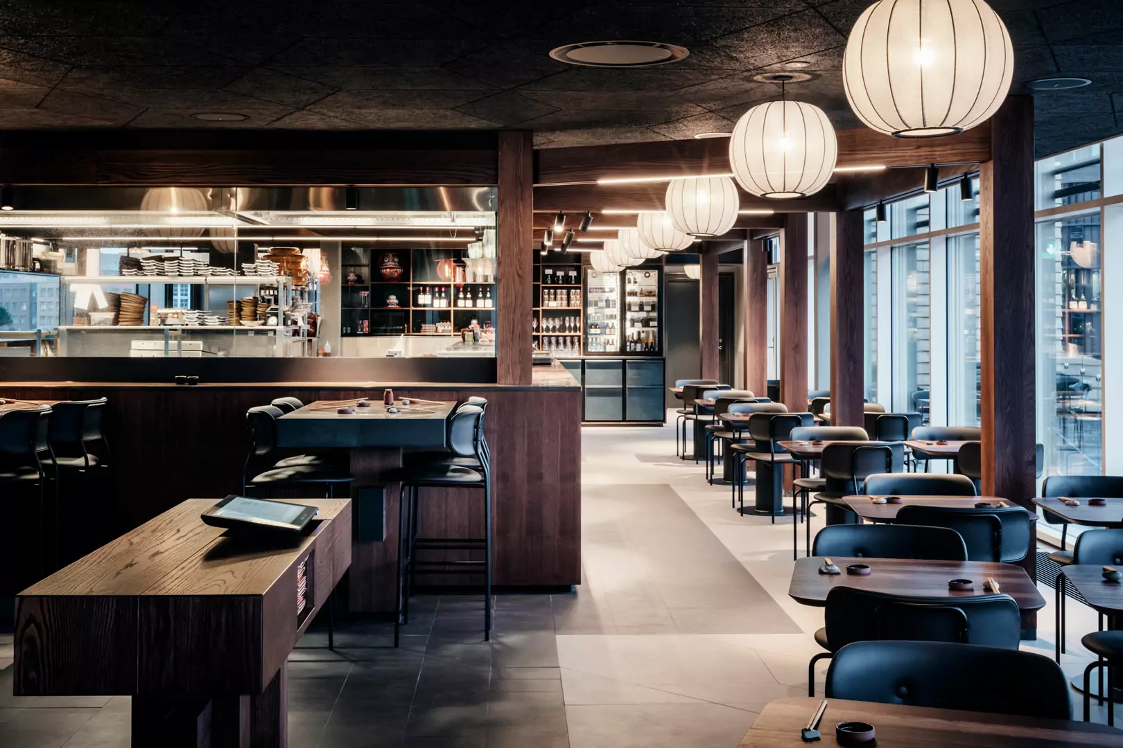Restauranten byder på en 400 kvadratmeter stor urban garden-terrasse, hvor gæsterne om sommeren kan spise i private kroge i japanskinspirerede pavilloner. Denne terrasse giver en følelse af ro midt i byens liv.