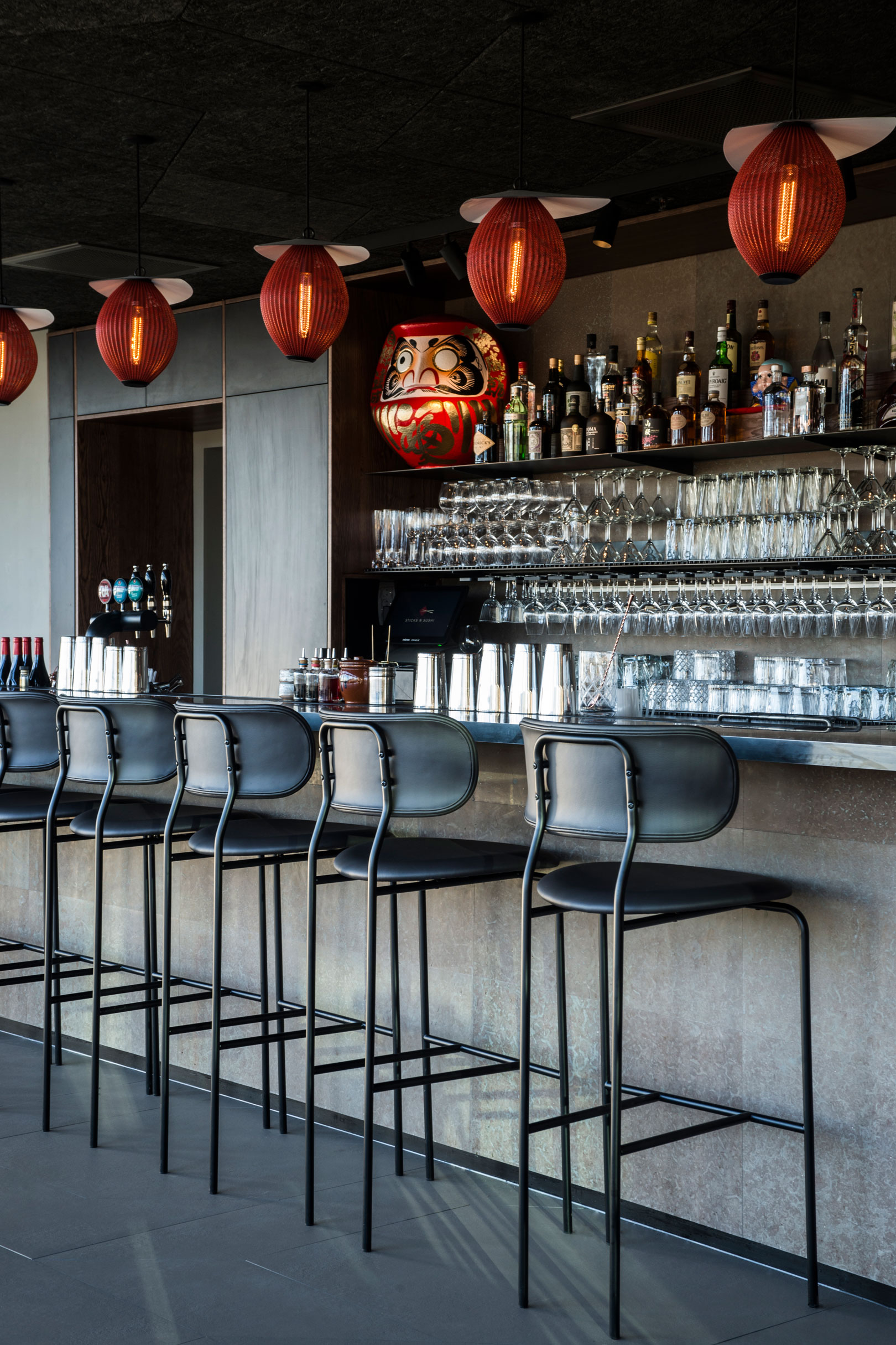 Sticks’n’Sushi i Tivoli Haven præsenterer en indretning, hvor japansk enkelhed møder dansk hygge. Restauranten er ikke som de andre spisesteder i byen. Indretningen er formet som en stor fisk, og mønstrene i gulvet glider sammen som glitrende fiskeskæl. Rummet kombinerer dansk ro og hygge med japansk minimalisme og enkelhed, mens du kan se kokkene tilberede dine sushi-retter midt i lokalet.