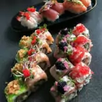 Udover de klassiske og de moderne former for sushi, finder du også indslag fra det japanske køkken som gyoza, misosuppe og japanske snacks, som ofte følger med for at give dybde og variation til måltidet.