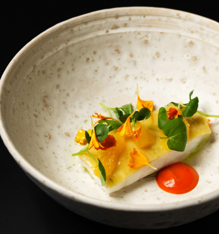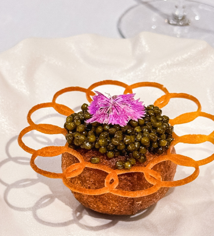 Chawanmushi, en silkeblød japansk æggestand, serveres med kongekrabbe, bottarga og en frisk urtesalat. Herefter frister en delikat hummer-doughnut med dansk hummer og Rossini black label caviar. Foie gras marineret i cognac med kvædebouillon og honninggel tilfører en perfekt balance mellem sødme og dybde.