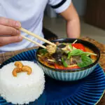Når det bliver køligere, eller du bare har brug for noget, der for alvor mætter og varmer, er karryretterne en sikker vinder. Den grønne karry med kokosmælk, thai-basilikum og bambusskud er både stærk og rund – en ret, der passer til en langsom søndag, hvor du har god tid. Den røde karry har lidt mere dybde og sødme, mens massaman-karryen, med sin mere jordede smag og noter af kanel og stjerneanis, næsten føles som efterår på en tallerken.