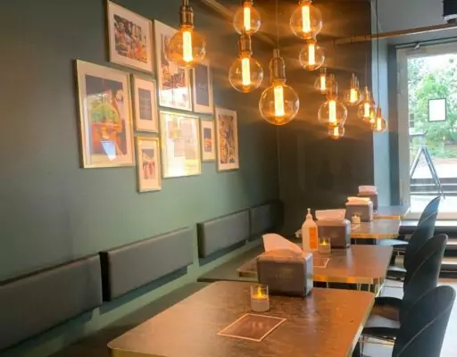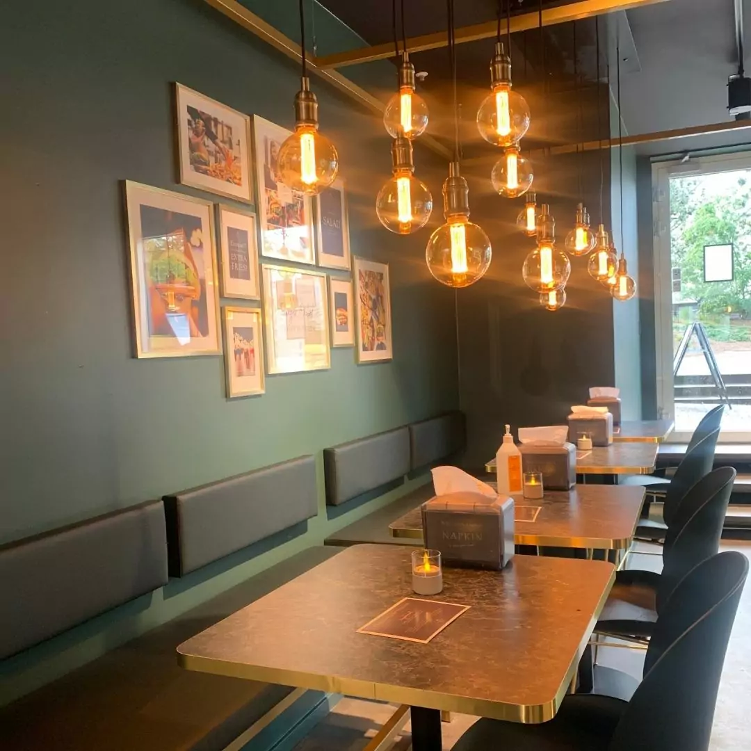 Restauranten har et moderne, men samtidig hyggeligt design med et åbent og indbydende layout. Der er masser af plads til at slappe af, og den åbne køkkenløsning giver gæsterne mulighed for at følge med i, hvordan deres burger bliver tilberedt.