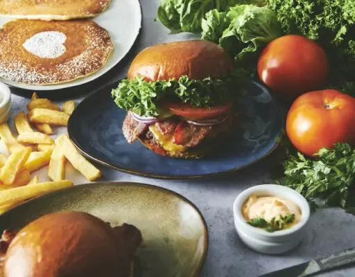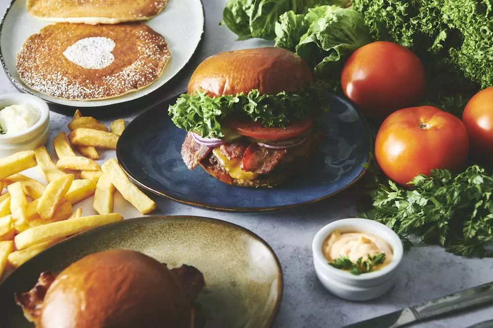 Burgerne er et centralt element på menuen, hvor klassikere som cheeseburger og bacon jam cheeseburger serveres med friske ingredienser og husets egne saucer. For dem, der ønsker et vegetarisk alternativ, tilbyder restauranten en Beyond Meat-baseret burger, der ikke går på kompromis med smagen. Til morgenmad og brunch kan gæsterne nyde fluffy pancakes, serveret med sirup og smør, eller en solid portion æg og bacon.