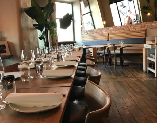 Restauranten er indrettet med moderne og hyggelige træborde, der skaber en varm og rustik atmosfære.